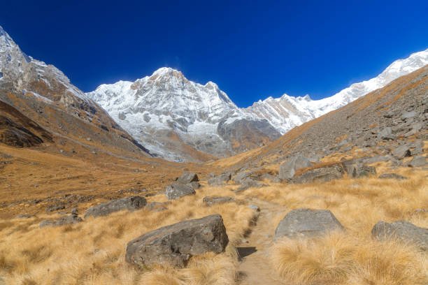 Annapurna Circuit trek within the mountain ranges of central Nepal. The total length of the route varies between 160–230 km (100-145 mi), depending on where motor transportation is used and where the trek is ended. This trek crosses two different river valleys and encircles the Annapurna Massif. The path reaches its highest point at Thorung La pass (5416m), reaching the edge of the Tibetan plateau. Most trekkers hike the route anticlockwise, as this way the daily altitude gain is slower, and crossing the high Thorong La pass is easier and safer.